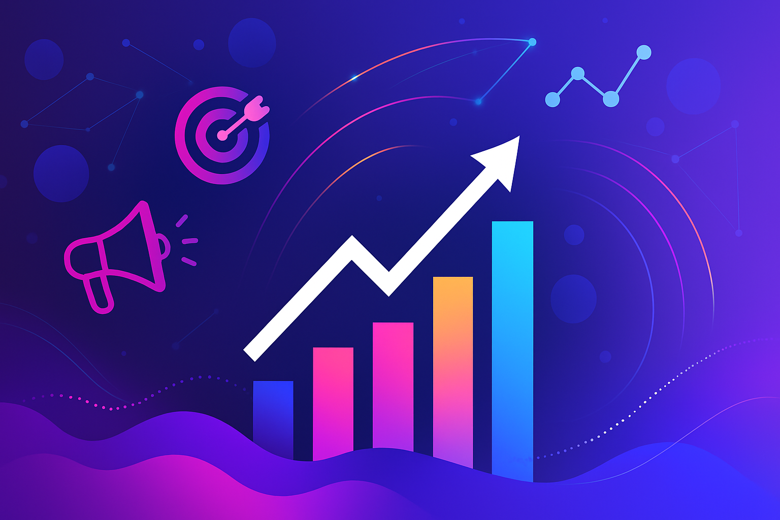 Abstrakte Illustration zum digitalen Marketing und Wachstum mit Balkendiagramm und Aufwärtspfeil